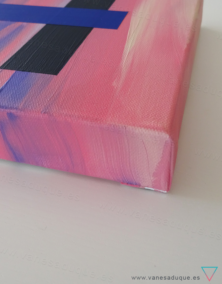 F: 3,5 cmPintado a pincel con acabado barniz mate. Lienzo de algodón y bastidor de madera con cantos gruesos pintados.